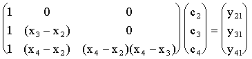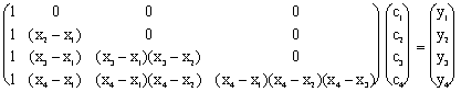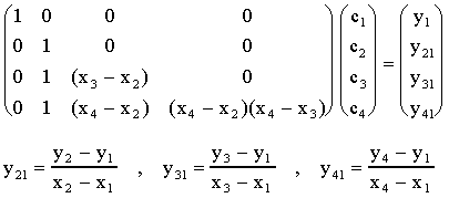 Inmediatamente vemos que c1=y1. Restandole la primera fila a las ecuaciones dos, tres y cuatro y diviendo estas por (x2-x1), (x3-x1), (x4-x1) respectivamente, obtenemos el sistema transformado: