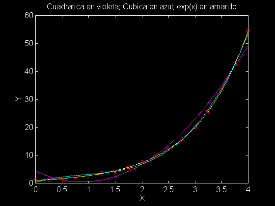 Ejemplo: Para ilustrar las ideas presentadas hasta ahora, considere el caso de aproximar 17 datos tomados de la función y=ex en el intervalo [0,4] utilizando un polinomio cuadrático y otro cúbico: