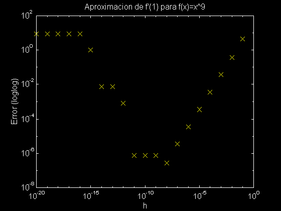 Podemos ver que los errores disminuyen hasta un cierto valor critico "hmin" luego del cual los errores aumentan según la "h" disminuye. ¿Contradice esto el resultado de arriba de O(h) del error? ¡NO! El resultado de arriba es sobre la convergencia si la aritmética es exacta y se dice que es un resultado asintótico. La figura ilustra los efectos de redondeo debido a la aritmética finita los cuales se hacen significativos para "h" pequeño y pueden afectar cualquier formula numérica para aproximar la derivada. Sin embargo, una formula con un grado de aproximabilidad digamos O(h2) es preferible a una O(h) ya que los errores (teoricos) tienden a cero más rápido y asi la "h" no se tiene que hacerse tan pequeña reduciendo asi los efectos de los errores por la aritmética finita. <>