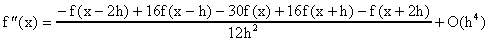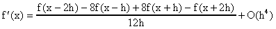 nos da una formula de orden cuatro para f'(x). Es importante observar que mientras más alto el grado de aproximabilidad de la formula, más suave tiene que ser la función para que dicha aproximación sea valida. Por ejemplo esta formula de orden cuatro requiere que la función tenga cinco derivadas continuas en el intervalo en cuestión mientras que la formula de orden dos requiere unicamente tres derivadas continuas.