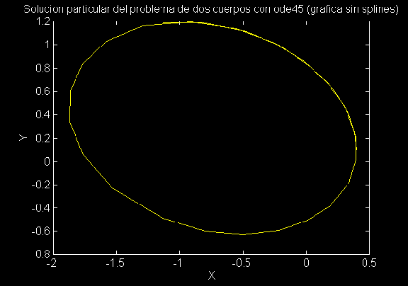 title('Solucion particular del problema de dos cuerpos con ode45 (grafica